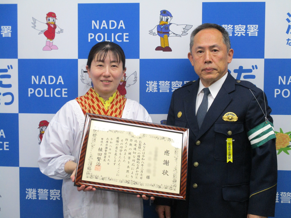 ![]() 飲食店店主は、来店した女性客に、近くに金を貸してくれる店がないか尋ねられたことから、事情を聞くと、「ウクライナから帰国できなくなった知人のために、渡航費用など200万円を借りてほしいとSNSでお願いされた。」と話したことから、詐欺被害にあっていると考え、女性客を説得して、警察へ通報し、詐欺被害を未然に防止してくださいました。