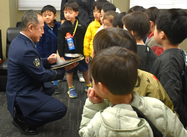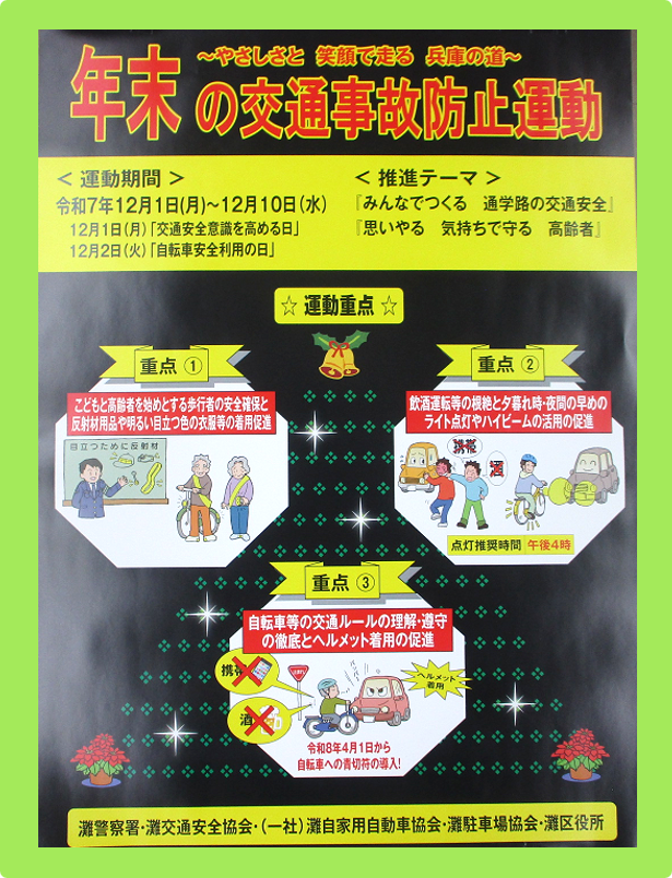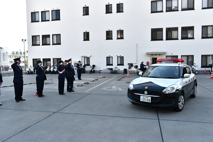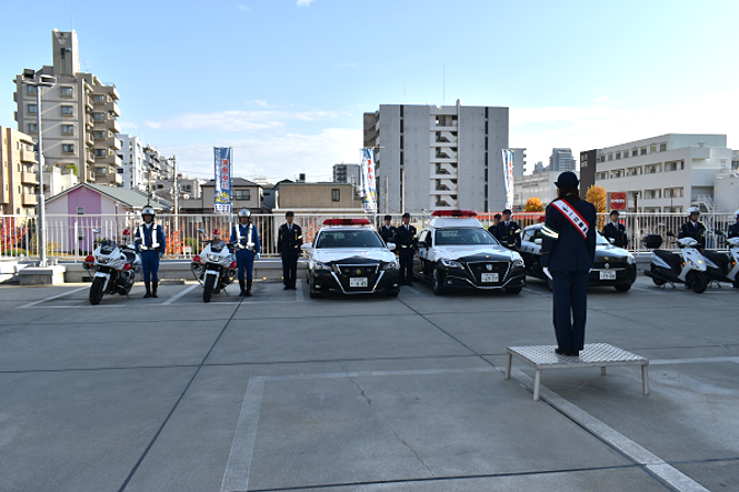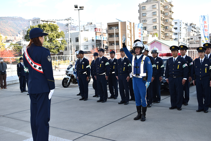 灘警察署協議会の福居会長を一日警察署長としてお迎えし、年末の交通事故防止特別取締隊の出発式を行いました。