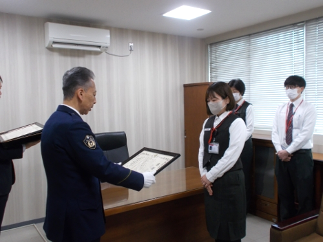 ![]() 特殊詐欺被害を未然に防いでいただいた神戸春日野郵便局、葺合郵便局の局員様に対し葺合警察署長より感謝状を贈呈しました。 ![]() 特殊詐欺被害を未然に防いでいただいた方に対し葺合警察署長より感謝状を贈呈しました。 ご協力ありがとうございました!