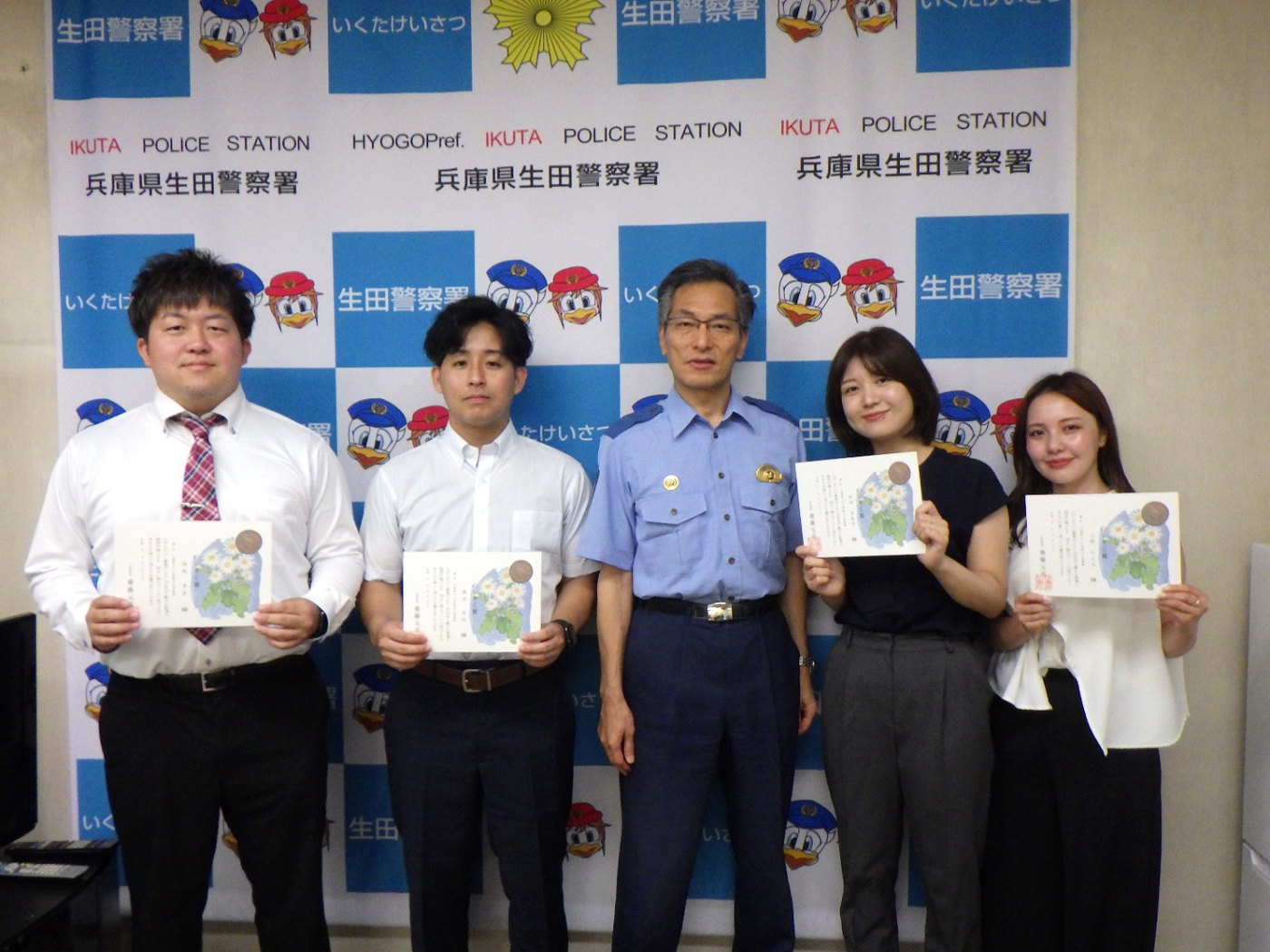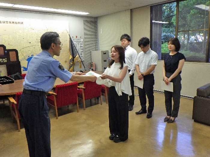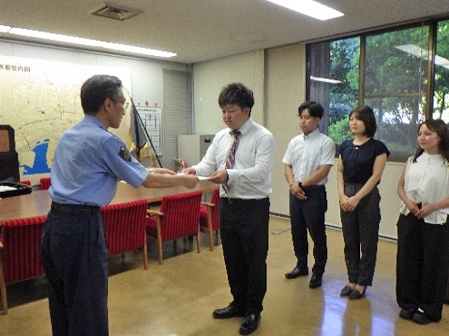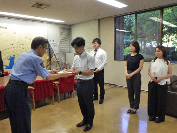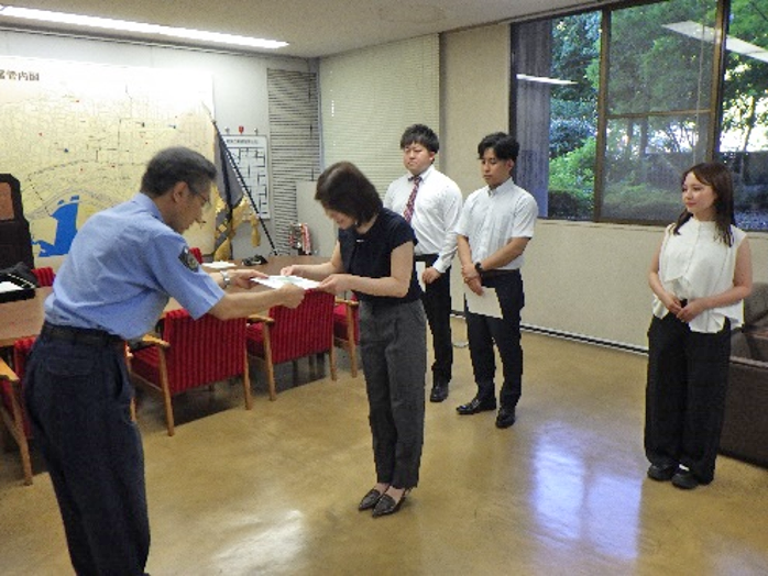 飲食店で心肺停止していた男性を、連携して心臓マッサージ等を実施し回復させ人命救助したことに対し、令和7年8月21日に生田警察署の署長室において4名の方に「のじぎく賞」を贈呈しました。