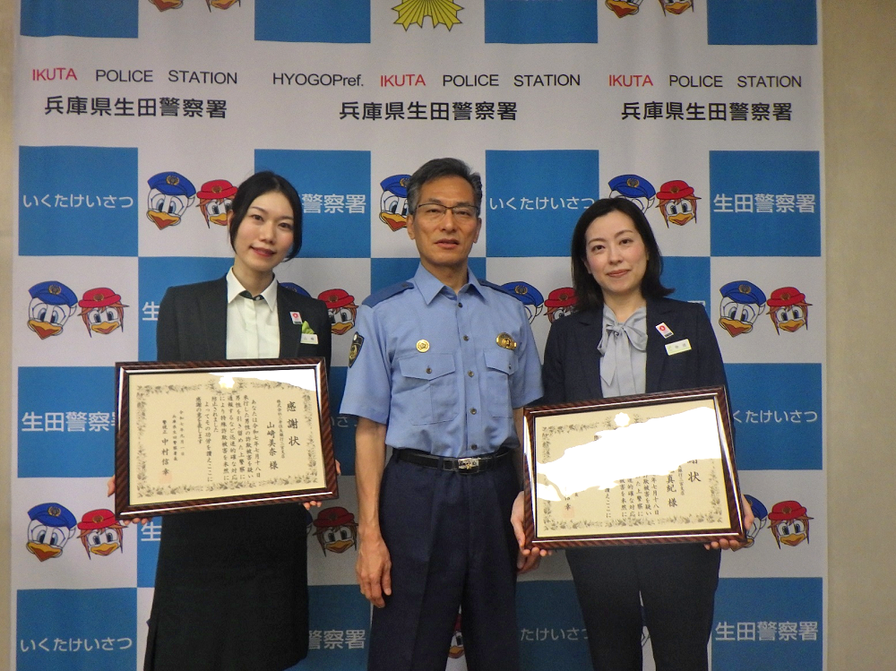 三井住友銀行三宮支店において、詐欺被害を疑い男性を引き留めた上、警察に通報するなど迅速的確な対応により特殊詐欺被害を未然に防止したことにより、令和7年9月1日に生田警察署の署長室において2名の方に生田警察署長から「署長感謝状」を贈呈しました。