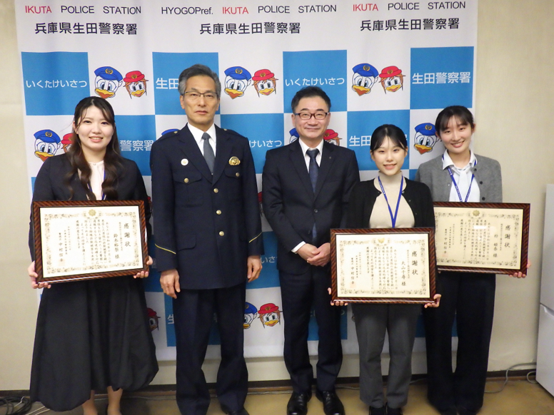 署長感謝状を贈呈しました 株式会社SBJ銀行神戸支店において、ネットバンキングから送金ができない旨の相談を受けたことから詐欺を疑い、警察に通報するなど迅速的確な対応により詐欺被害を未然に防止していただきました。 ![]() 鈴木 裕梨 さん ![]() 大山 千尋 さん ![]() 朴 姫奈 さん ![]() |