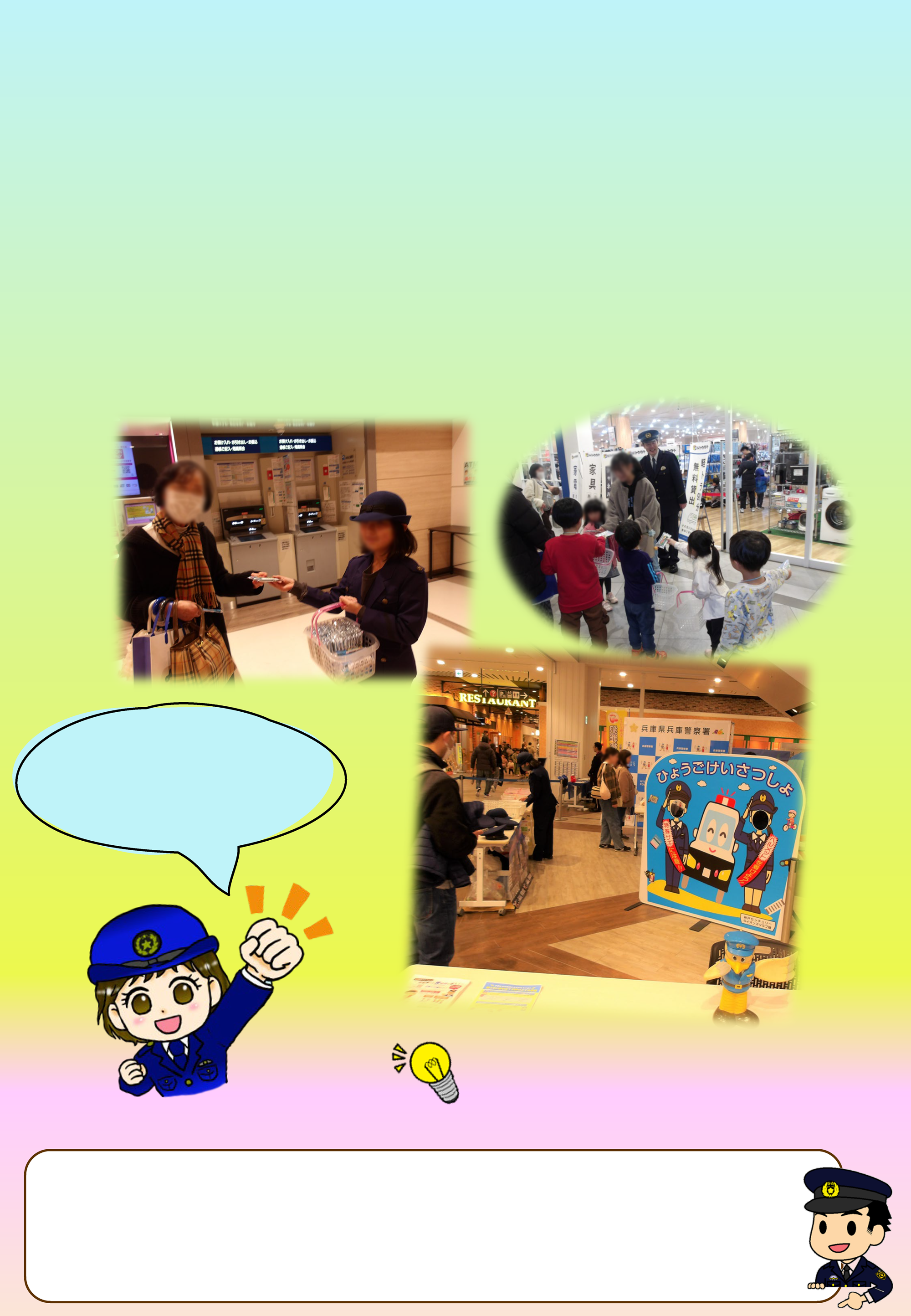 ☆こども警察官大活躍☆ 2月11日イオンモール神戸南店で開催された子どもたちの『おしごと体験会』に、兵庫警察署も参加しました。参加した子どもたちは、こども警察官となりATMを利用される方や買い物をするお客さんに、「詐欺に気を付けて下さい。被害にあわないで!」と呼び掛けながら、ティッシュを配ってくれました。 頑張ってくれたこども警察官の 特殊詐欺被害多発しています。 ~警察官採用試験のお知らせ~ 令和8年度第1回兵庫県警察官募集