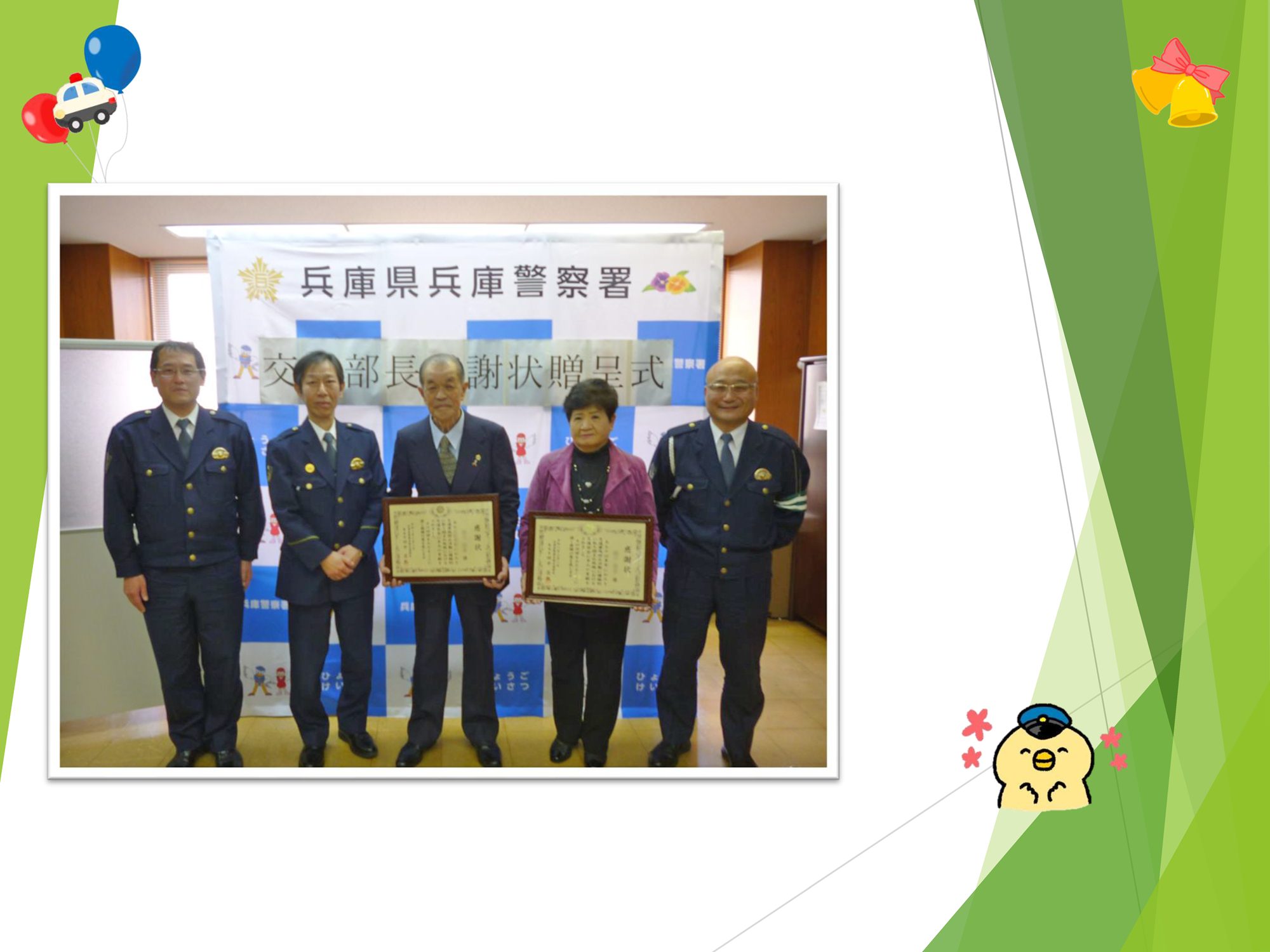 交通部長感謝状の贈呈 長きにわたり、地域交通安全活動推進委員として、交通安全活動に取り組んでいただいたお二人に感謝の意を表し、兵庫警察署において交通部長感謝状贈呈式を行いました。 地域交通安全活動推進委員とは 署長感謝状贈呈式 ![]() 神戸中道郵便局において、職員の方がATM操作に手間取る高齢者を発見し、声掛け等をしていただいたことで特殊詐詐欺を未然に防止することができました。