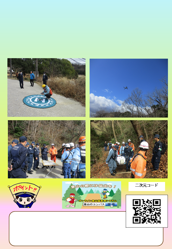 ☆山岳遭難救助訓練の実施☆ 3月4日、菊水山の登山道で、山岳遭難事故を想定し兵庫消防署及び株式会社菊水ゴルフクラブと協働して、同社のドローンを使用した救出救助訓練を実施しました。 ~安全な登山に向けて~ 署長感謝状の贈呈 兵庫県立兵庫工業高等学校デザイン科のみなさんに署長感謝状をお渡ししました。 ![]() ![]() ![]() ![]()