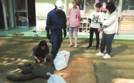 ![]() 👆先生対象の訓練:左が負傷者搬送訓練、右が資機材操作訓練の様子です