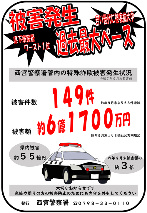 当署におきましても、特殊詐欺対策や交通事故防止、地域防犯の推進など、地域の皆さまと協働しながら「安全で安心な西宮」の実現に努めてまいりました。