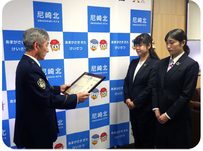 盗撮犯人逮捕への協力に 通勤・通学ラッシュの朝の駅で、女性のスカート内をスマートフォンで撮影していた男を確保し、警察に引継いでくださった男性に対して署長感謝状を贈呈しました。 ![]()