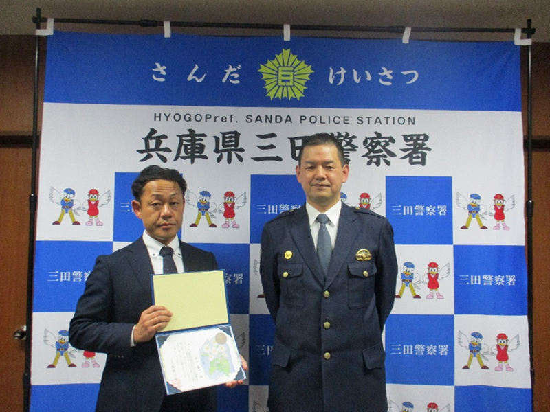 のじぎく賞の授与 令和7年12月15日午後1時ころ、線路を歩いている高齢者に気づいて、駆け寄って救出していただいた杉山陽一様に対して、兵庫県より、のじぎく賞が贈呈され、2月18日に三田警察署において署長より代理授与させていただきました! ![]()