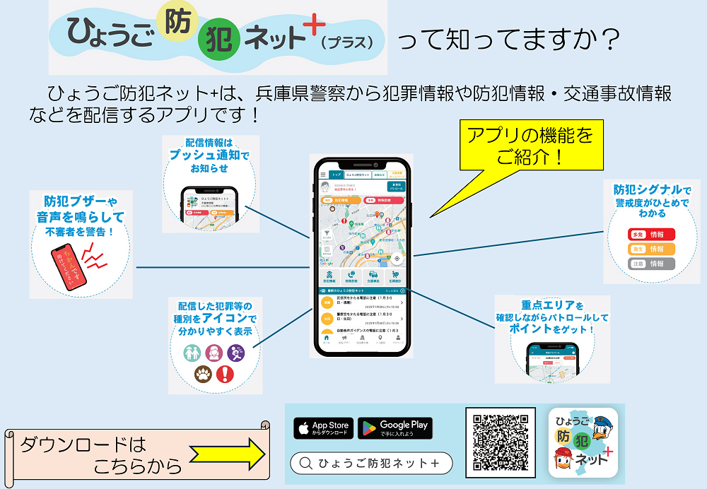 自転車の酒気帯び運転のほか、酒類の提供や同乗・自転車の提供に対して新たに罰則が整備されました。 「ひょうご防犯ネット+(プラス)」って知ってますか? |