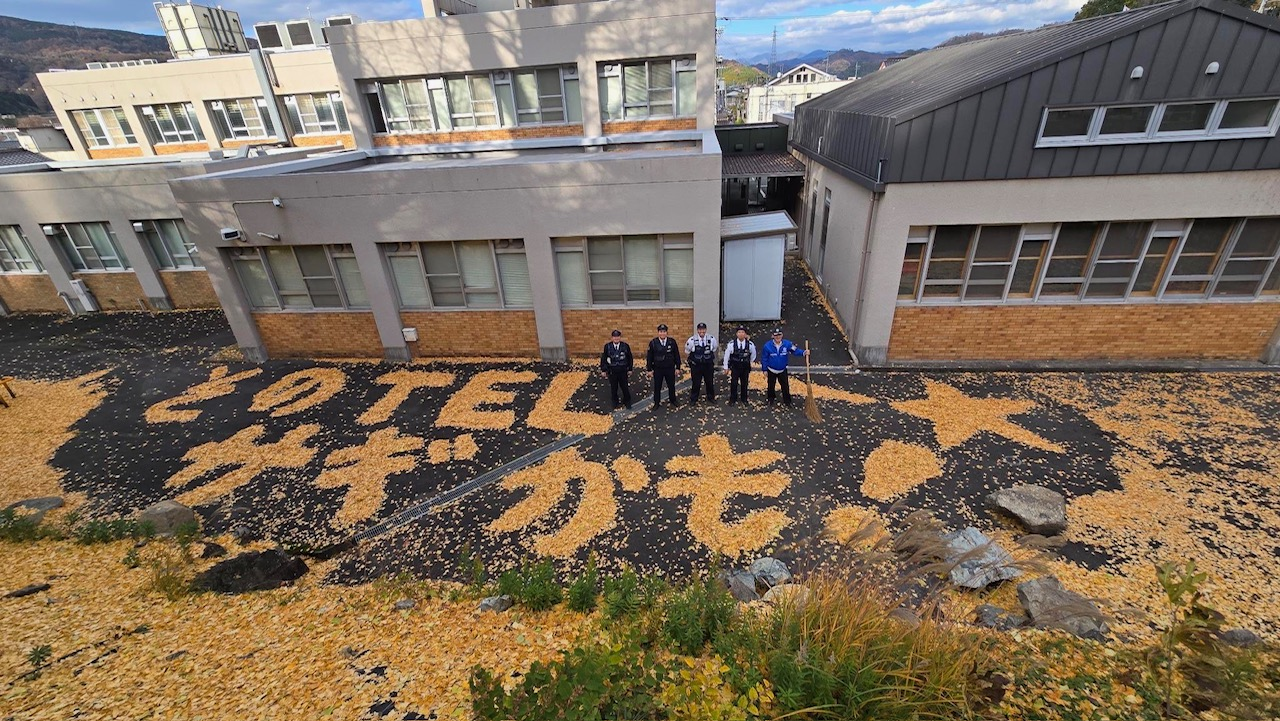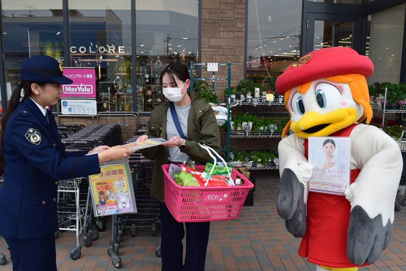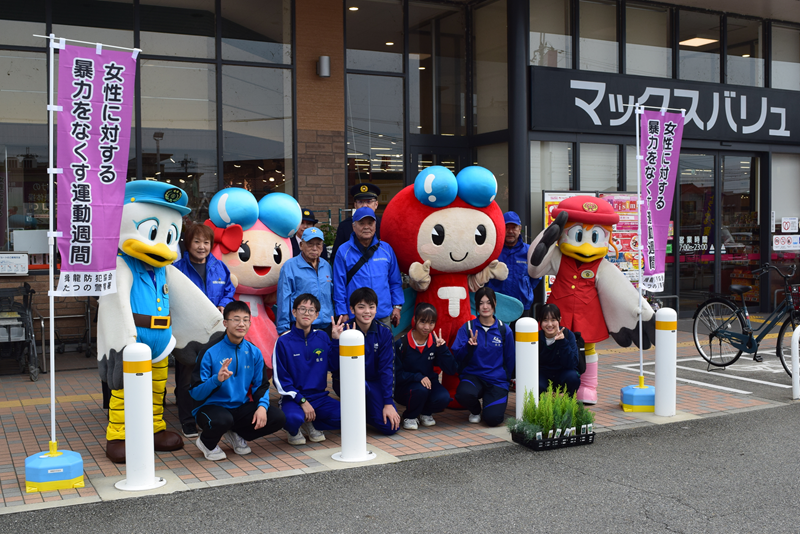 【佐用町 大イチョウで特殊詐欺防止】 たつの警察署佐用警察センター裏の高台には、佐用町の象徴で県の指定天然記念物でもある大イチョウ(樹齢1,000年、樹高28メートル)がありますが、毎年11月下旬ころ紅葉し、やがて、風が吹く度に、イチョウの葉がはらはらと舞い落ち、センター裏庭駐車場はまさに黄金色の絨毯を敷き詰めたようになります。 たつの警察署長 ![]() 「女性に対する暴力をなくす運動」キャンペーンの実施 ![]() ![]() 「令和7年全国地域安全運動キャンペーン」