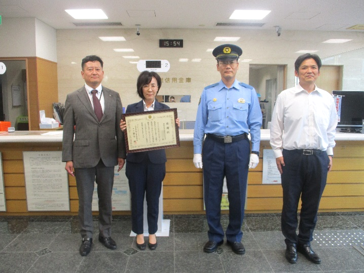 特殊詐欺未然防止による感謝状贈呈 令和7年9月8日、特殊詐欺被害の未然防止をしていただいた管内金融機関の行員の方に署長感謝状の贈呈を行いました。