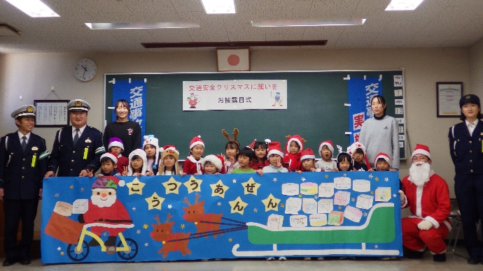「交通安全 クリスマスに願いを」 管内のこども園に協力いただき、サンタクロースやトナカイがそりを引くイラストに「交通安全を願うメッセージ」を貼り付けた交通安全横断幕を作成しました。