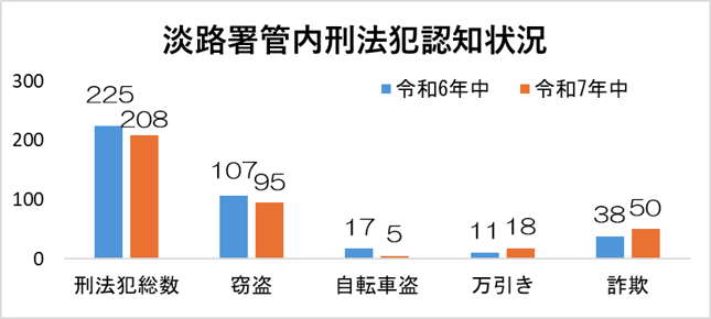 淡路署管内における令和7年中の犯罪情勢 〇刑法犯認知件数が減少 淡路署管内における令和7年中の刑法犯認知件数は208件であり、令和6年中に比べて17件減少(-7.6%)し、令和6年、令和7年と2年連続で減少しました。