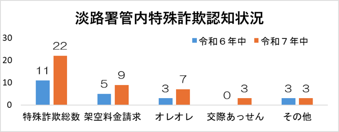〇特殊詐欺被害が増加 令和7年中の特殊詐欺被害は22件で、令和6年中に比べて11件増加しました。 ● 未納料金等の名目でお金を騙し取る架空料金請求詐欺 ● 警察官を名乗って「あなたの口座が犯罪に利用されている」と言って現金を振り込ませて騙し取るオレオレ詐欺 ● 「女性紹介」のための会員登録料や保証金名目でお金を騙し取る交際あっせん詐欺 などが発生、高齢者に限らず幅広い年齢の方が被害に遭われています。