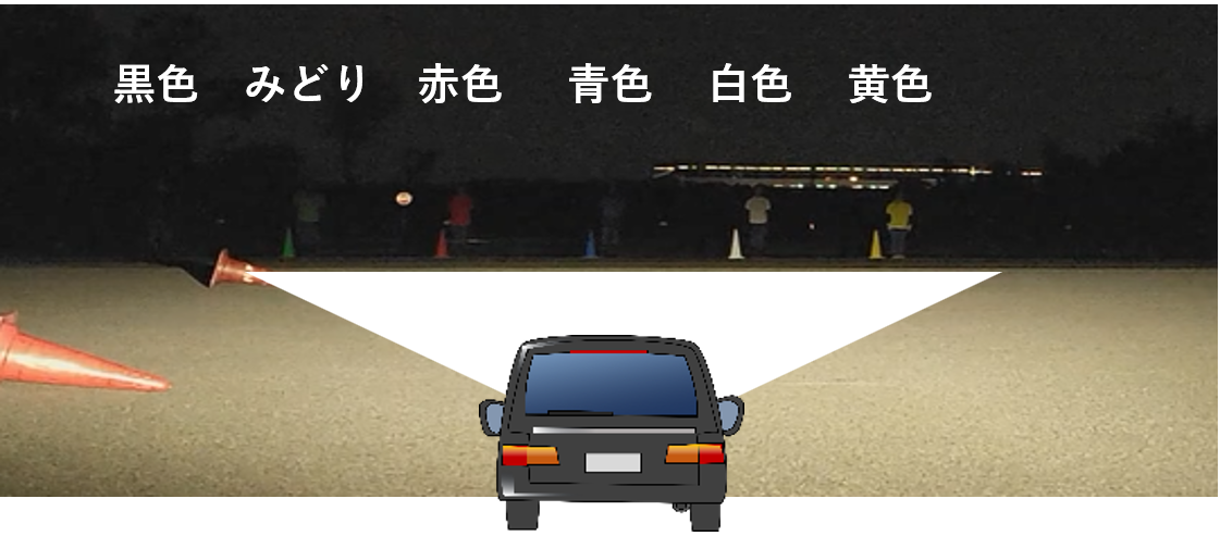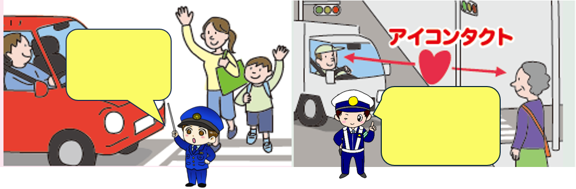 信号機のない横断歩道で歩行者を見かけたら、必ず止まってください‼ 渡ろうとする意思、渡ってくださいの意思をお互いに合図(アイズ)してください‼ 明るい服装と反射材の活用 ロービームの時の見え方