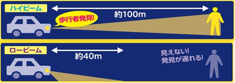 ハイビームの活用 ~原則ハイビーム~ ハイビーム時とロービーム時の見える距離の違い ![]() ハイビーム(走行用前照灯)時には、約100メートル先の歩行者が発見できますが、ロービーム(すれ違い用前照灯)だと、約40メートル先までしか見えません。