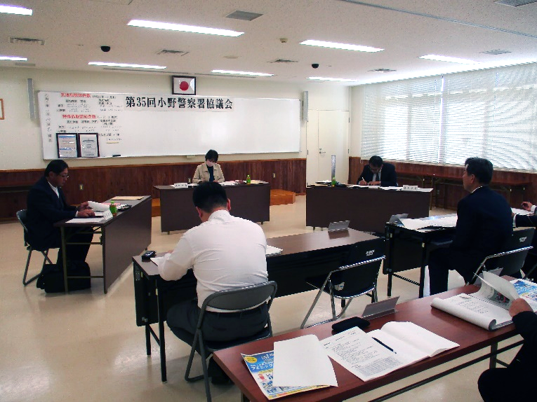 当署において小野警察署協議会を開催しました。 自転車盗をはじめとした街頭犯罪の取締りや効果的な防犯対策などについて意見交換を行いました。