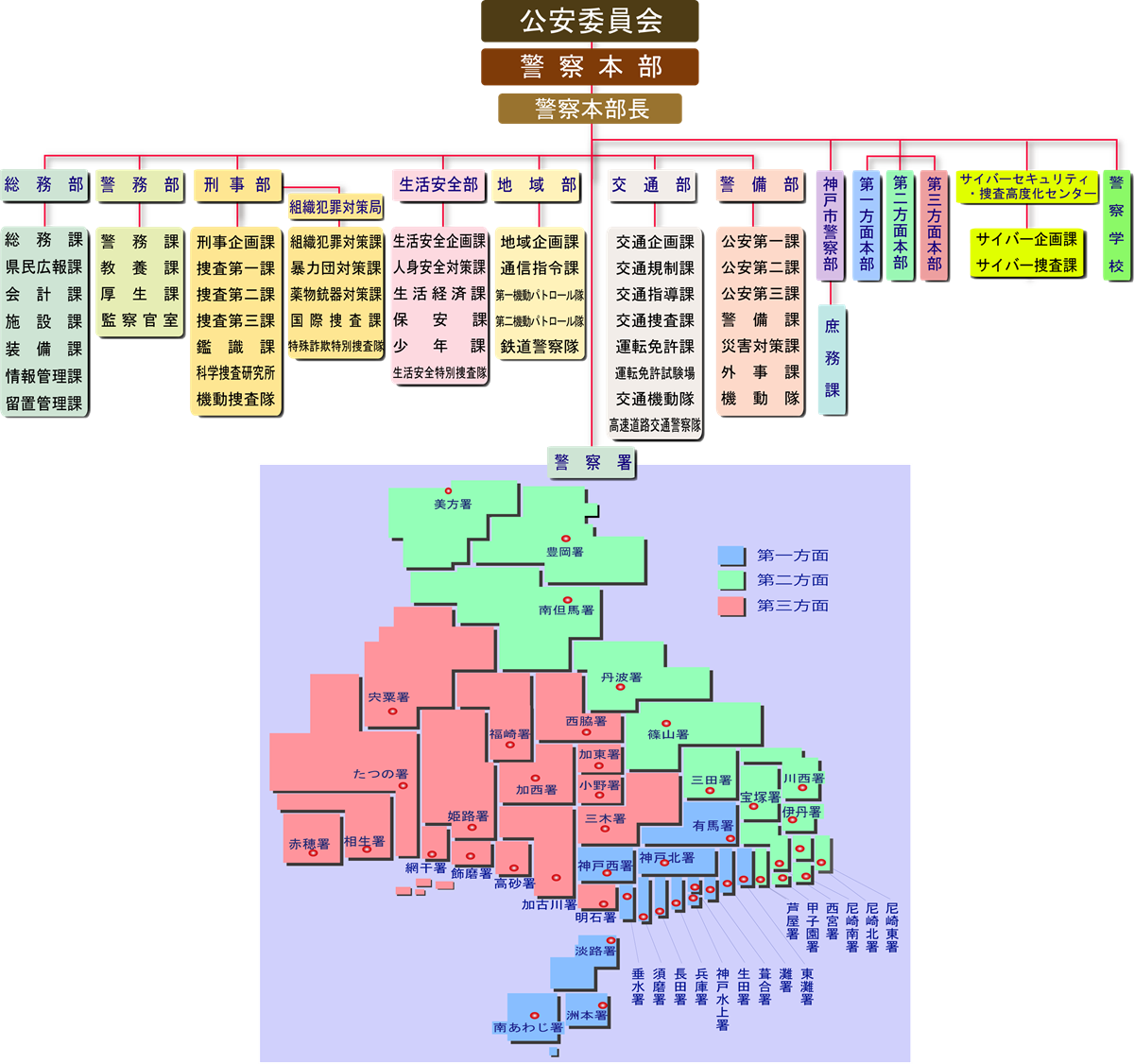 警察本部には、総務・警務・刑事・生活安全・地域・交通・警備の各部と神戸市警察部、第一から第三の方面本部及びサイバーセキュリティ・捜査高度化センター、警察学校があります。