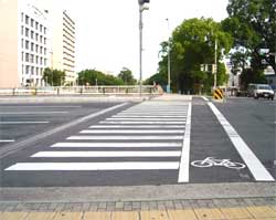 この通行方法は、交差点を直進する自転車が、一旦、左折する様にして自転車横断帯に入るため、不自然かつ不合理であり、場合によっては、左折しようとする自動車と交錯するなどの危険な状況が生じていることから、現在設置している自転車横断帯の撤去を進めています。