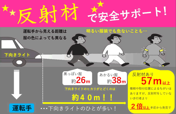 歩行者の方は、早朝・薄暮・夜間等に外出する際は、明るい服装(白色、黄色等)と反射材を着用し、車の運転者に自分の存在をアピールしましょう。